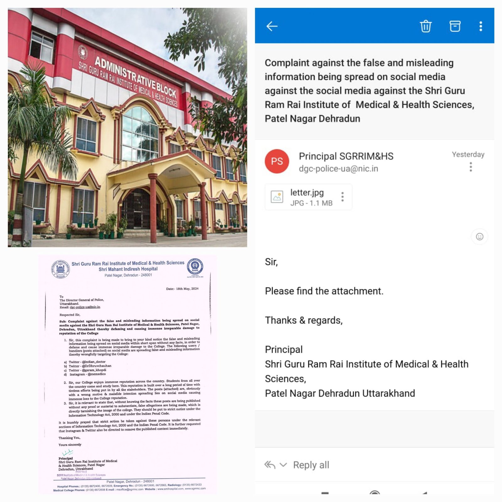मेडिकल काॅलेज प्रबन्धन ने यह मांग की है कि ट्विटर@इंडियन डाॅक्टर, ट्विटर@डाॅ ध्रुव चैहान, ट्विटर@गर्म खोपड़ी, इंस्ट्राग्राम@मीमेडिको के खिलाफ कड़ी कार्रवाई की मांग