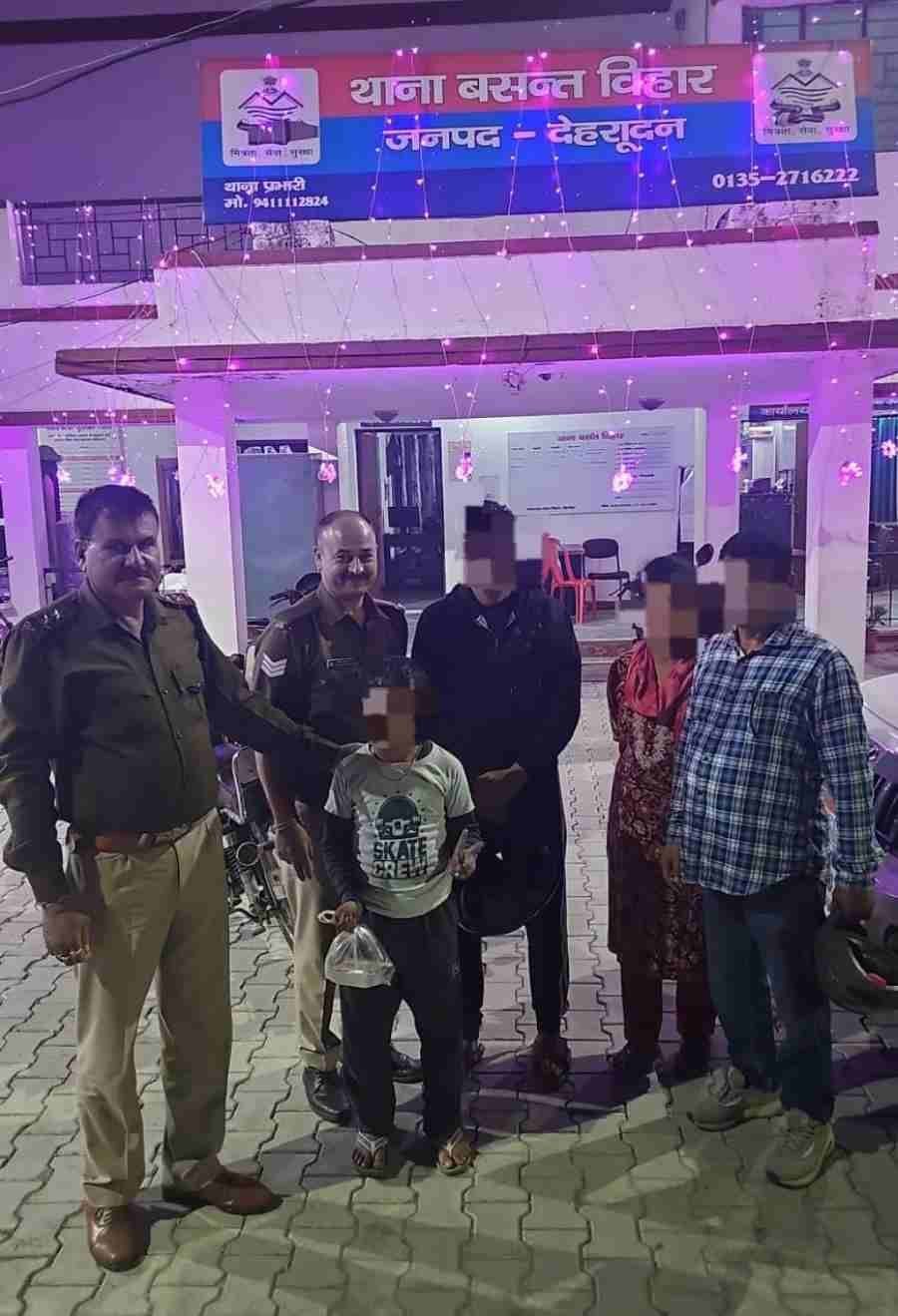देहरादून: थाना बसंत विहार पर एक व्यक्ति निवासी न्यू वसंत विहार एनक्लेव द्वारा सूचना दी की उनका भांजा उम्र 10 वर्ष घर से कहीं चला गया है प्राप्त सूचना पर तत्काल टीम गठित कर वर्तमान में प्रचलित ऑपरेशन स्माइल के तहत पुलिस मुख्यालय से प्राप्त निर्देशों के क्रम में वरिष्ठ पुलिस अधीक्षक देहरादून द्वारा बालक की यथाशीघ्र सकुशल बरामदगी हेतु आवश्यक निर्देश दिए गए। जिसके अनुपालन में पुलिस टीम द्वारा बालक के घर के आसपास आने जाने वाले लोगों से गुमशुदा बालक की फोटो दिखाकर पता लगाने का प्रयास किया तथा आसपास लगे सीसीटीवी फुटेजों की सहायता से बालक को मोहित नगर से सकुशल बरामदकर परिजनों के सुपुर्द किया गया।