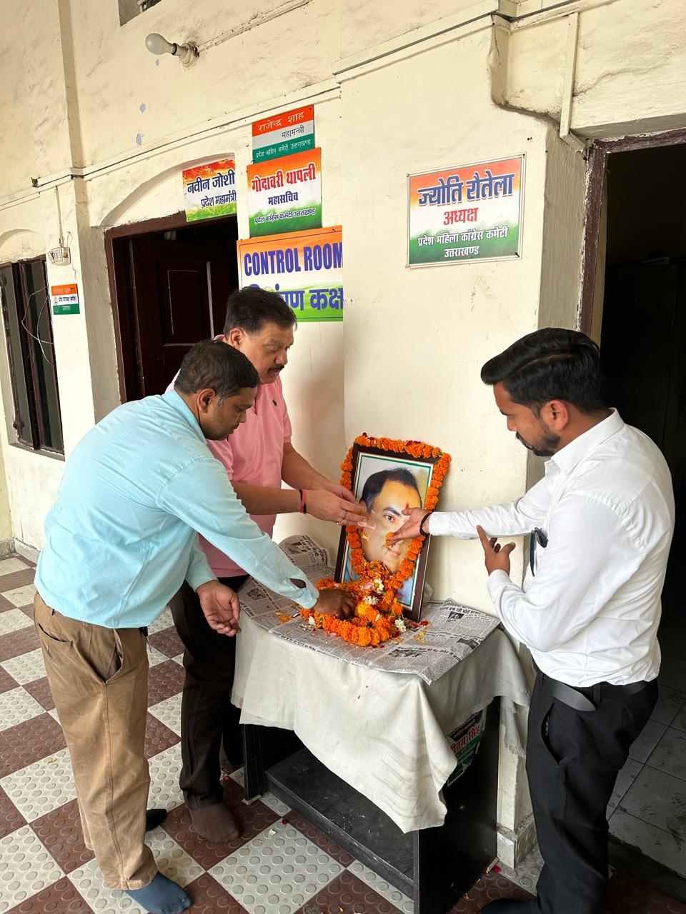 देहरादून। उत्तराखंड प्रदेश कांग्रेस कमेटी ने भारत रत्न पूर्व प्रधानमंत्री स्व. राजीव गांधी का उनकी 33वीं पुण्य तिथि पर भावपूर्ण स्मरण कर श्रद्धा सुमन अर्पित किए। राजधानी देहरादून स्थित राजीव भवन में पार्टी के मुख्य मीडिया समन्वयक राजीव महर्षि के नेतृत्व में पूर्व प्रधानमंत्री की प्रतिमा पर पुष्प अर्पित कर दिवंगत नेता के राष्ट्र के विकास में दिए अतुलनीय योगदान और उन्नति के लिए किए गए कार्यों को याद किया।