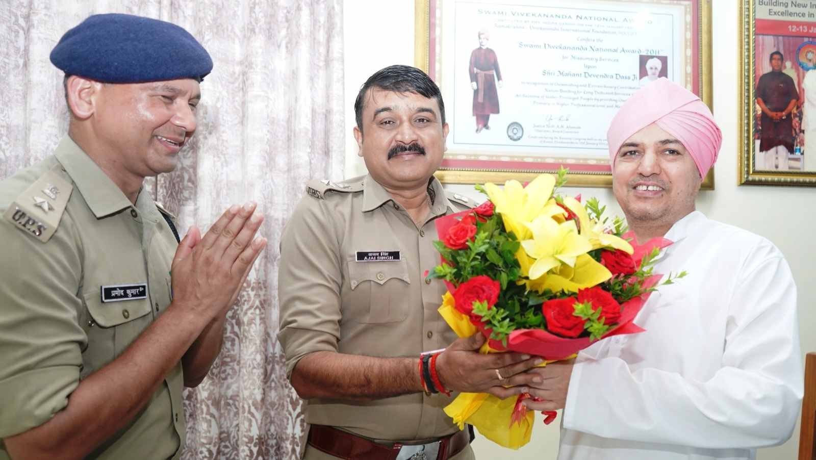 बुधवार को श्री दरबार साहिब की परंपरा के अनुसार पुलिस कप्तान अजय सिंह व पुलिस अधीक्षक प्रमोद कुमार (एस पी सिटी) का स्वागत हुआ। चर्चा के दौरान श्रीमहंत देवेन्द्र दास जी महारज व वरिष्ठ पुलिस अधीक्षक, पुलिस अधीक्षक नगर के मध्य शहर की यातायात व्यवस्था व कानून व्यवस्था सहित विभिन्न समसामयिक बिन्दुओं पर बातचीत हुई। एसएसपी ने कहा कि श्री दरबार साहिब एवम् श्री महंत इन्दिरेश अस्पताल में आगन्तुकों का भारी दबाव रहता है। उन्होंने दोनों स्थलों पर सीसीटीवी कैमरों की व्यवस्थाए निगरानीए सुरक्षा व्यवस्था सहित कई महत्वपूर्णं बिन्दुओं पर सुझाव भी दिए। वरिष्ठ पुलिस अधीक्षक ने श्रीमहंत इन्दिरेश अस्पताल के द्वारा मरीजों को दी जा रही स्वास्थ्य सेवाओं की प्रशंसा की।